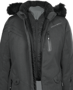 • Reflective trim for increased safety. • YKK zippers. • Dual storm flap. • New Built-In Wind Shield Vest with knit back-draft protector collar. • Northern Fleece lined adjustable collar. • Adjustable detachable hood with detachable fun fur trim. • Zippered Waterproof outer shell pockets lined with waterproofed brushed cotton lining. • Waterproof zippers on chest and sleeve. • Concealed handy zipper pocket under front flap. • Shaped sleeves with slim cuffs and Velcro adjustments, and thumb controlled Lycra wind-stopper inner cuffs. • Adjustable elasticized wind-stopper cord with pulleys at hips. • Inner pockets : mesh pockets, zip pocket and MP3/Mobile pocket. • Detachable adjustable wind-guard cummerbund.